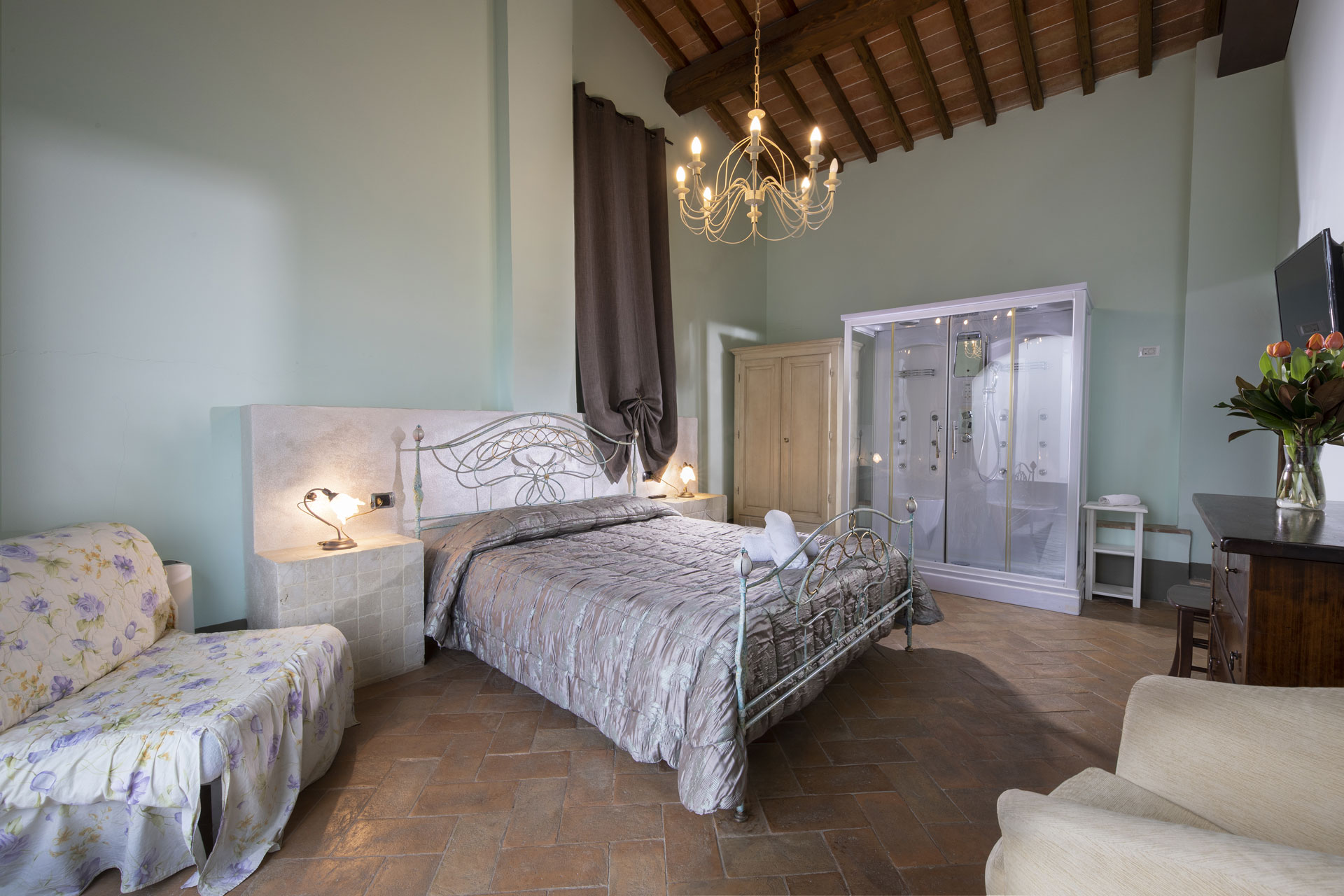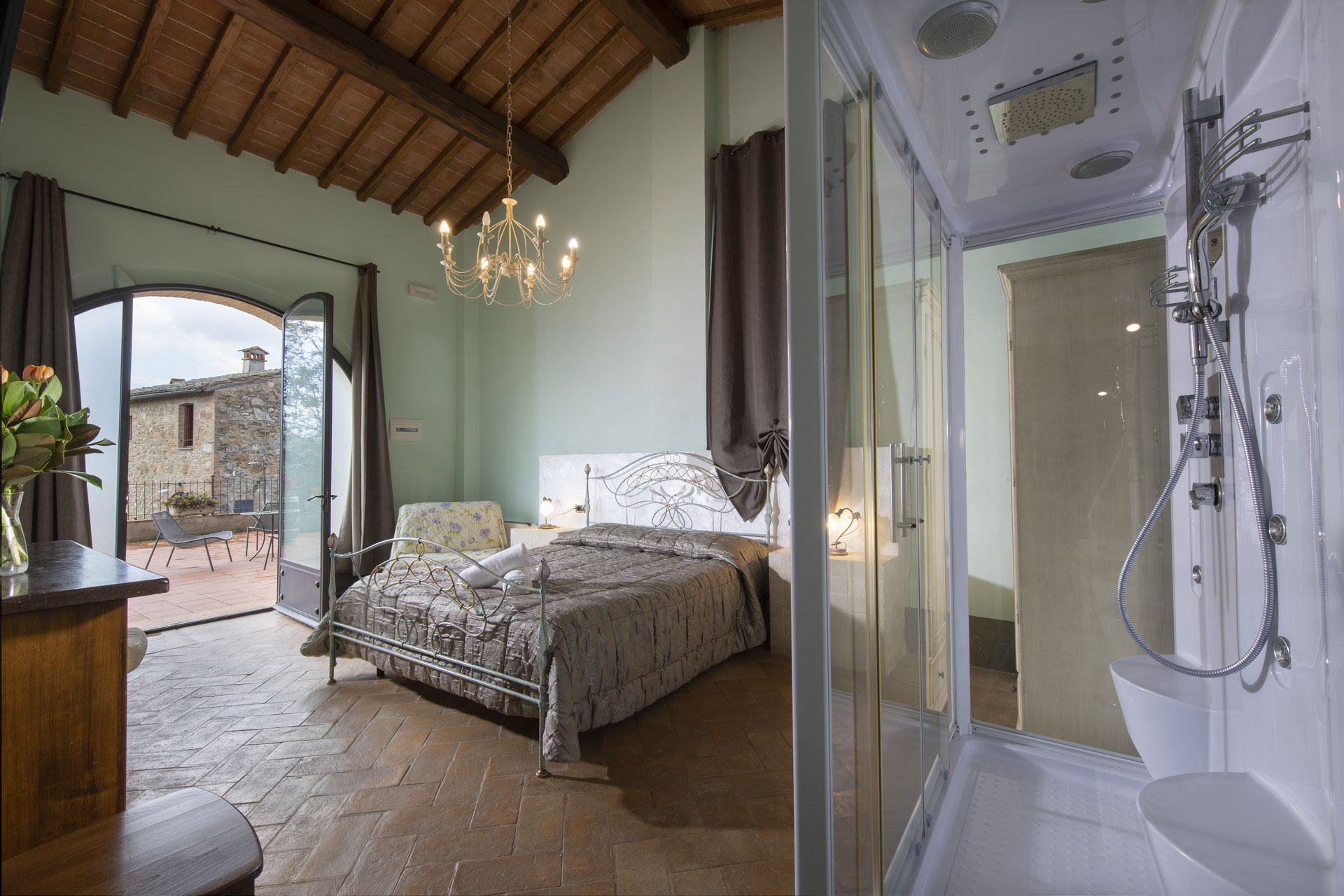 The Sauvignon Room is a refined double room in San Gimignano, offering an enchanting view of the historic Abbey of Monteoliveto. With its beamed ceiling, elegant furnishings, and private en-suite bathroom, this room blends authentic Tuscan character with timeless comfort.