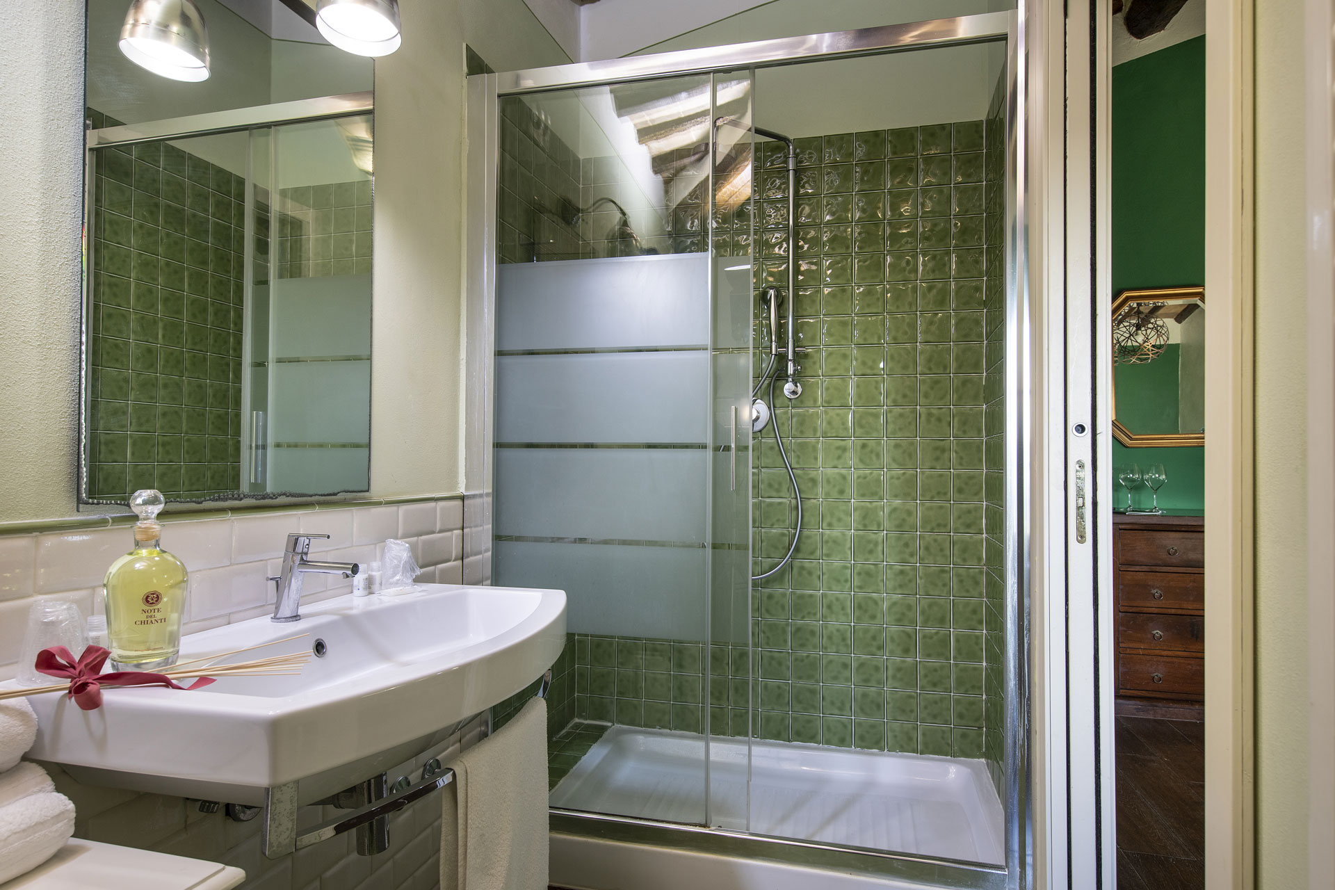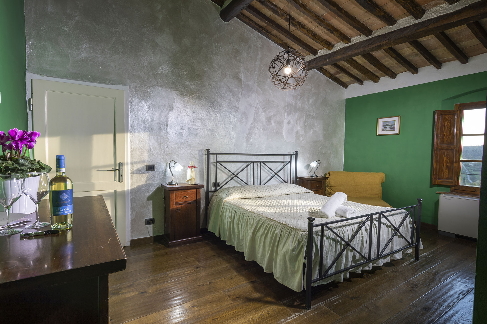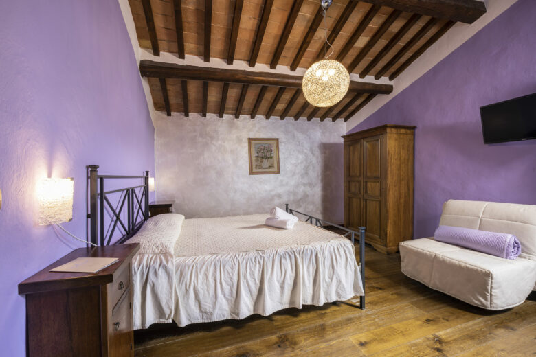 Double room with a beamed ceiling and a magnificent view of the Abbey of Monteoliveto. Includes an en-suite bathroom, a jacuzzi shower in the bedroom, satellite TV, air conditioning and heating. The room is reached through a private terrace. A third bed may be added upon request.