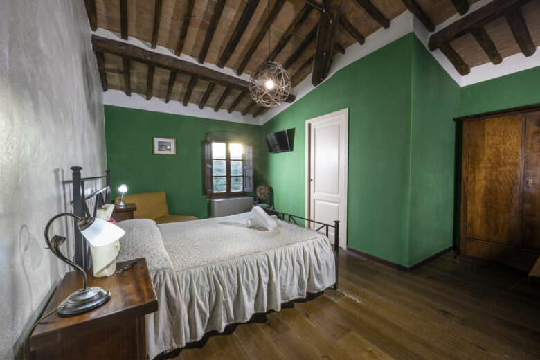 Double room with a beamed ceiling and a magnificent view of the Abbey of Monteoliveto. Includes an en-suite bathroom, a jacuzzi shower in the bedroom, …