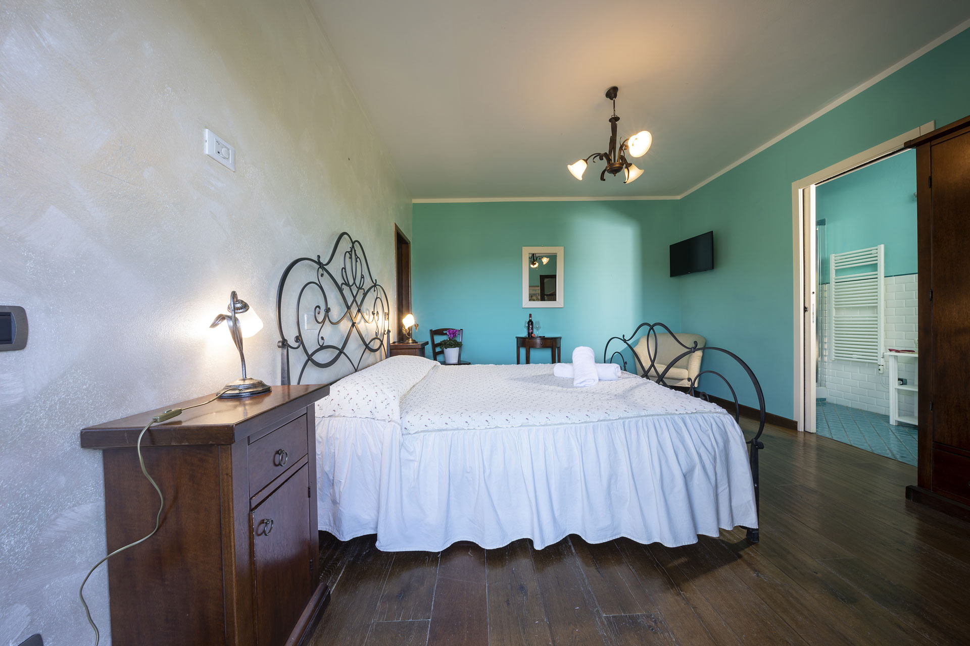 Equipped with satellite TV, air conditioning, and heating, La Vernaccia Room ensures comfort in every season. Its harmonious design and attention to detail make it ideal for couples or solo guests looking for a relaxing stay in the heart of Tuscany, surrounded by vineyards and the timeless beauty of San Gimignano.